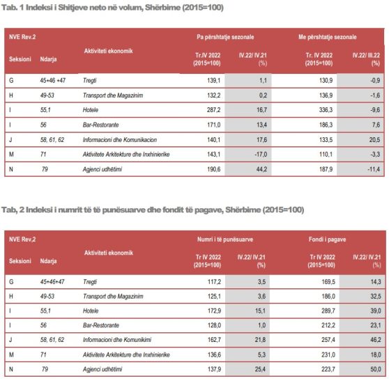 Indeksi i shitjeve në aktivitetin Informacion dhe Komunikacion shënoi rritje 18%, krahasuar me tremujorin e katërt 2021 dhe pagat u rritën me 46%.