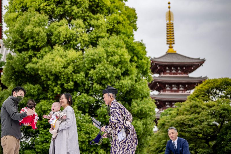 Çiftet e të vegjëlve të veshur me përparëse ceremoniale sumo u mbajtën nga prindërit e tyre dhe u përballën me njëri-tjetrin në unazën e sumos në Tempullin Sensoji në Tokio të shtunën.