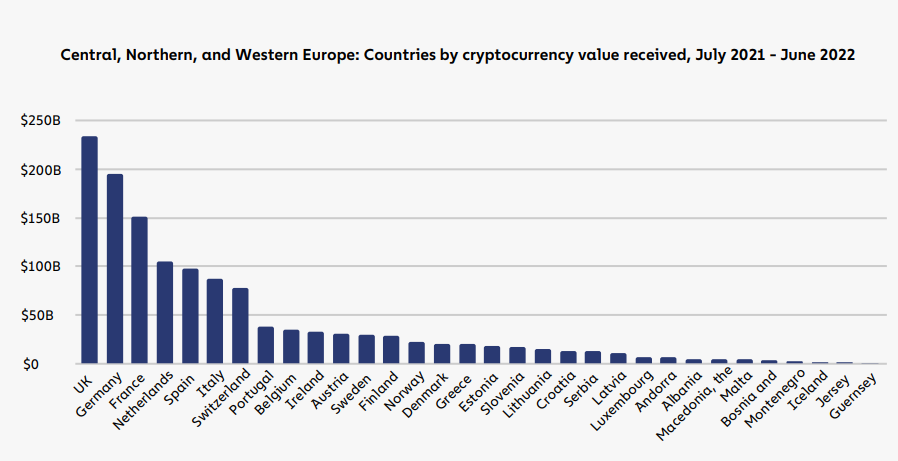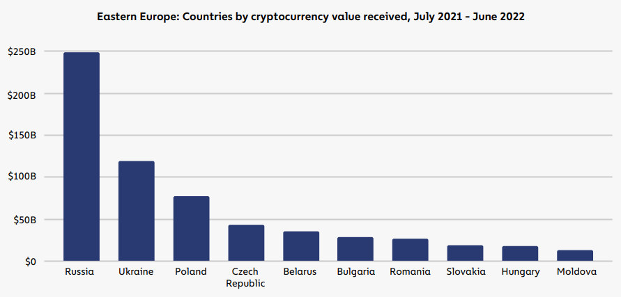 Gjatë korrik 2021-qershor 2022, në Rusi kanë hyrë rreth 250 mld dollarë vlerë në kriptomonedha. Gjithsesi vlera më e madhe i përket SHBA-së, e cila për të njëjtën periudhë ka marrë 1 trilion dollarë kriptomonedha.
