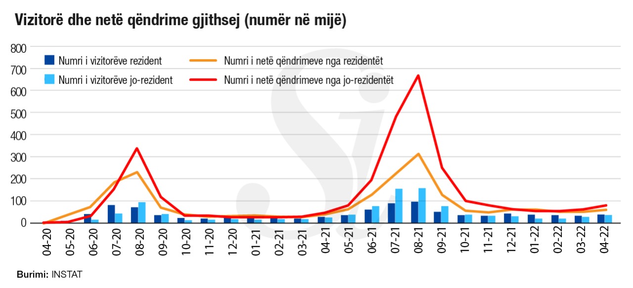 Numri i netë qëndrimeve gjithsej është rritur me 59.0%, në krahasim me të njëjtën periudhë të vitit të shkuar. Gjatë muajit Prill 2022, është shënuar rritje e numrit të vizitorëve gjithsej me 35.1% krahasuar me Prill 2021.