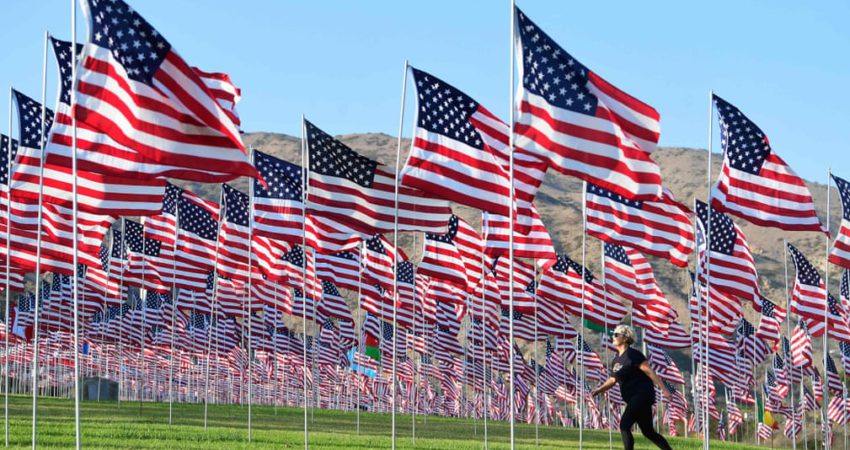 Një grua duke kaluar para flamujve të vendosur për të kujtuar 20 vjetorin e ngjarjeve të 11 Shtatorit. Flamujt valëviten në Universitetin Pepperdine në Kaliforni