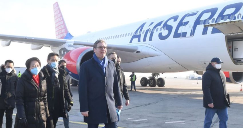 Presidenti i Serbisë, Aleksandar Vuçiq ka dalë në aeroport së bashku me ambasadoren kineze në Beograd, Chen Bo për të pritur avionin.