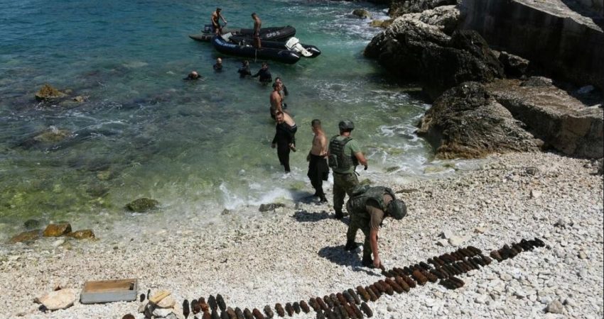Nën një shkëmb në gjirin e Vlorës, një nga vendet më të bukura në rivierën shqiptare, një zhytës del nga uji duke mbajtur një predhë artilerie të cilën e vendos me kujdes në plazhin me guralecë.