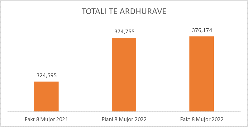 Të ardhurat doganore u realizuan në vlerën 143.8 miliardë lekë ose 20.8% më shumë se 8 mujori i vitit të shkuar nga të cilat 100.5 miliardë lekë u arkëtuan nga TVSH e importit, me 26.7% rritje nga 8 mujori i 2021-shit.