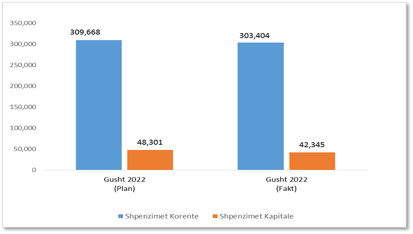 Shpenzimet korente dhe ato kapitale,për periudhën 8-mujore, kanë shënuar një realizim respektivisht në masën 98 përqind dhe 87.7 përqind të planit të periudhës.