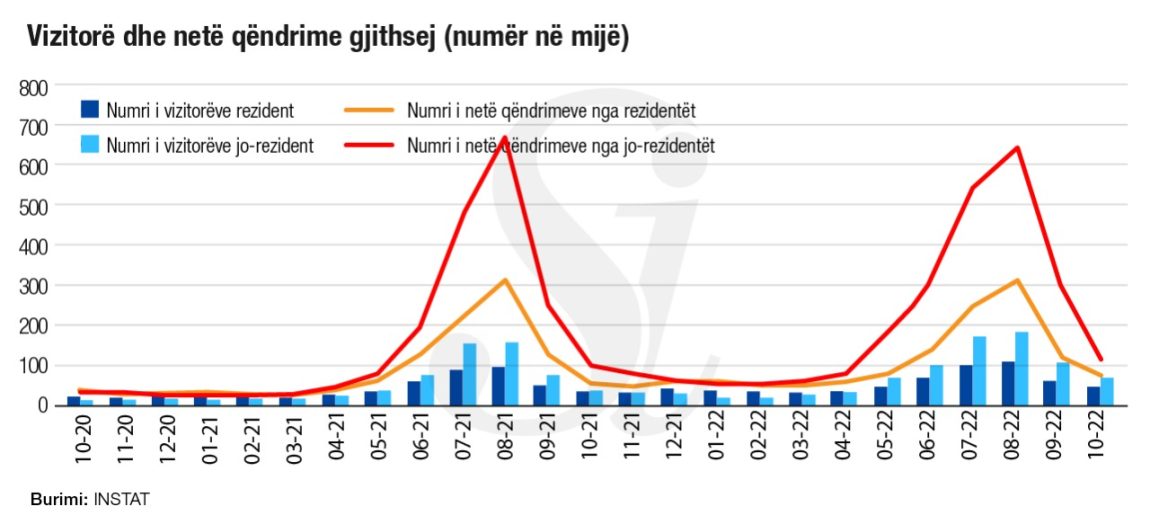 Edhe për vizitorët e huaj (jo rezidentë) preferenca është e dukshme për qendrën, kryesisht bregdetin. Në tetor qendra tërhoqi gati 50% të të huajve që vijnë në vend për turizëm.