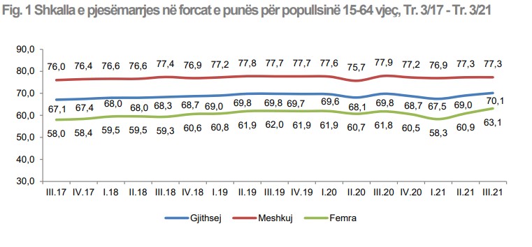 Sipas INSTAT, Në tremujorin e tretë 2021, shkalla e pjesëmarrjes në forcat e punës, për popullsinë 15-64 vjeç, është 70.1%. Krahasuar me tremujorin e tretë të vitit 2020, shkalla e pjesëmarrjes në forcat e punës është 0.3 pikë përqindje më e lartë, ndërkohë që krahasuar me tremujorin e mëparshëm është rritur me 1.1 pikë përqindje.