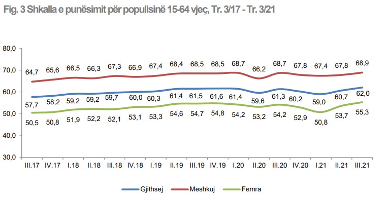 Gjatë tremujorit të tretë të vitit 2021, shkalla e punësimit për popullsinë 15-64 vjeç është 62.0%.