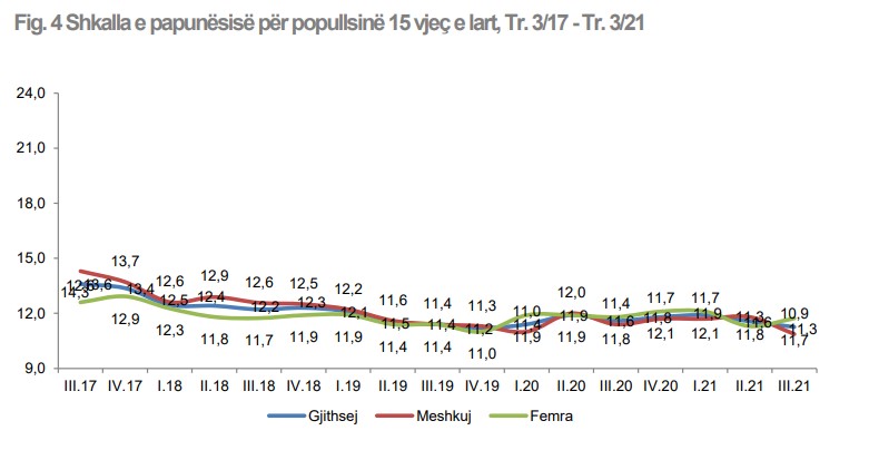 Për burrat ajo është 10.9% dhe për gratë 11.7%. Krahasuar me të njëjtin tremujor të vitit 2020, shkalla e papunësisë është ulur me 0.5 pikë përqindje për burrat, dhe është ulur me 0.1 pikë përqindje për gratë.