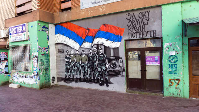Një murale në gjysmën veriore të Mitrovicës paraqet ushtarët serbë që luftuan nën flamurin e Jugosllavisë gjatë konfliktit. ‘Ia vlen të vdesësh për këtë vend,’ shkruan teksti me alfabet cirilik.