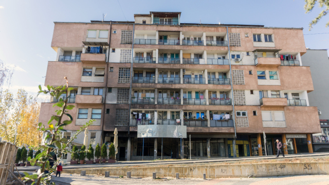 Në anën jugore, shqiptarët shesin flamuj shqiptarë dhe amerikanë. ATM-të shërbejnë për të tërhequr euro. Një xhami gjendet mbi një shesh tregu të zhurmshëm.