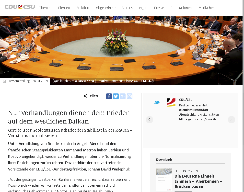 Por në një reagim të numrit dy të grupit parlamentar CDU/CSU në faqen zyrtare të kësaj partie, në lidhje me samitin e Berlinit, çështja e Shqipërisë apo Maqedonisë sa u përket negociatave nuk përmendet fare. Vëmendja kryesore përqendrohet te normalizimi i marrëdhënieve mes Serbisë dhe Kosovës dhe domosdoshmërisë për të arritur një marrëveshje, duke dalë kundër idesë për shkëmbimin e territoreve. Gjithashtu zyrtari gjerman kërkon që Kosova të shfuqizojë taksën 100 % të vendosur ndaj mallrave nga Serbia dhe Bosnje-Hercegovina.