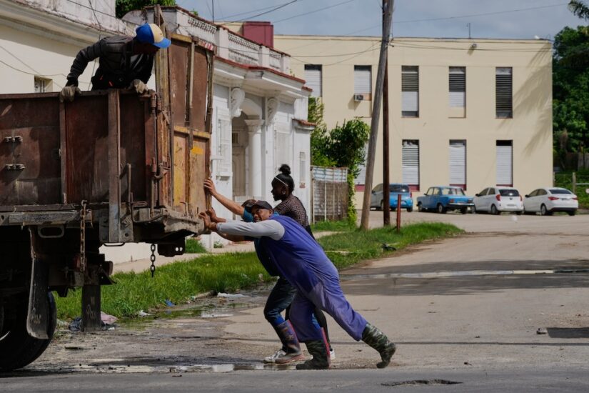 Punëtorët e mbledhjes së mbeturinave shtyjnë një kamion në Havana, 2025