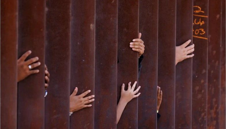 Emigrantët presin ushqim midis gardheve kufitare midis Meksikës dhe SHBA-së.
