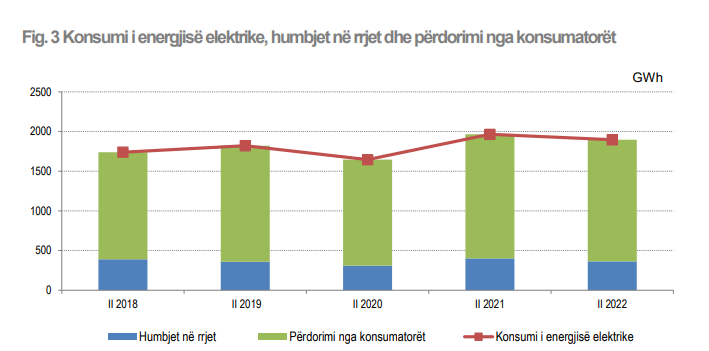 Përdorimi i energjisë elektrike nga konsumatorët, në tremujorin e dytë të vitit 2022, u ul me 2% duke arritur vlerën 1.533 GWh nga 1.563 GWh që ishte në tremujorin e dytë të vitit 2021.