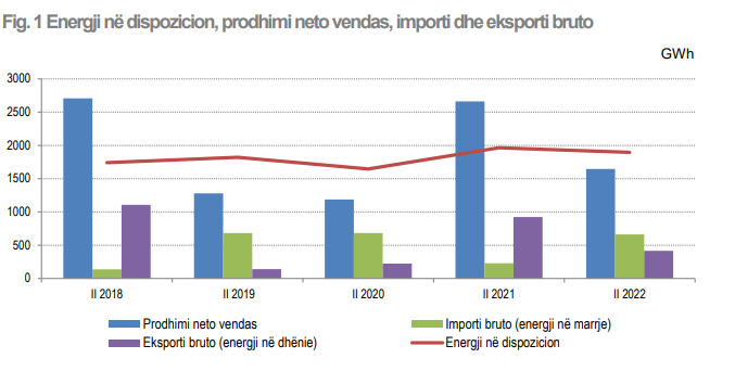 Importi i energjisë u trefishua nga një vit më parë, duke arritur në 664 gigavatorë energji të blerë, ndërsa eksporti ra me më shumë se 50%, duke u ulur në 415 gigavatorë të shitur. Shkëmbimi i energjisë elektrike (diferenca mes eksportit dhe importit bruto të energjisë), në tremujorin e dytë të vitit 2022 ka arritur vlerën negative prej 249 GWh krahasuar me tremujorin e dytë të vitit 2021 ku kishte një vlerë pozitive prej 696 GWh.