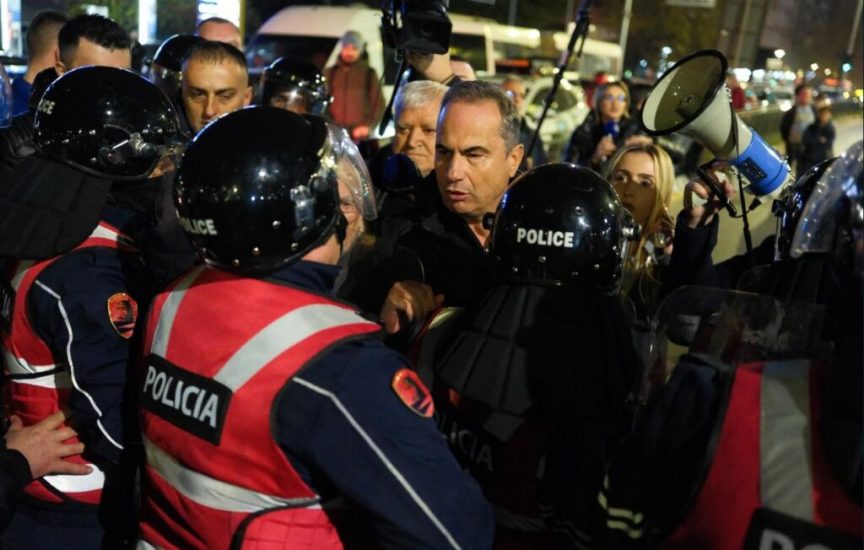 Sekretari i Përgjithshëm i Partisë së Lirisë, Tedi Blushi hipi mbi autobotin e policisë pas tensioneve me efektivët blu.