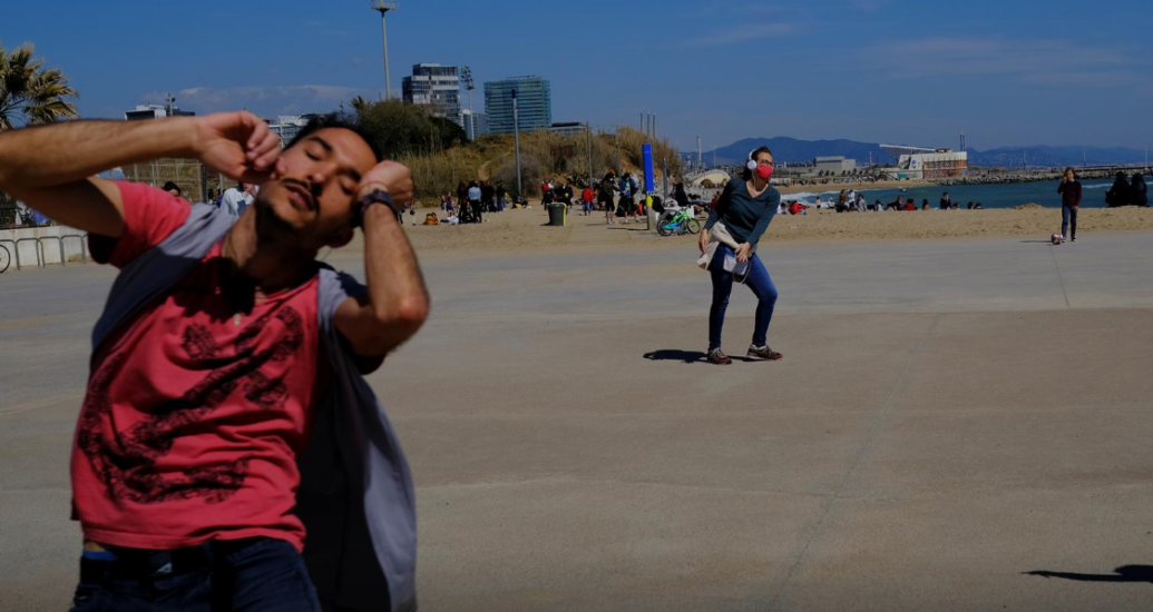 Të dielën, njerëzit e mirëpritën ditën e parë të pranverës duke vendosur kufjet e tyre dhe duke kërcyer në plazhin Mar Bella përgjatë bregdetit të famshëm të Barcelonës, të gjithë duke respektuar distancimin social.