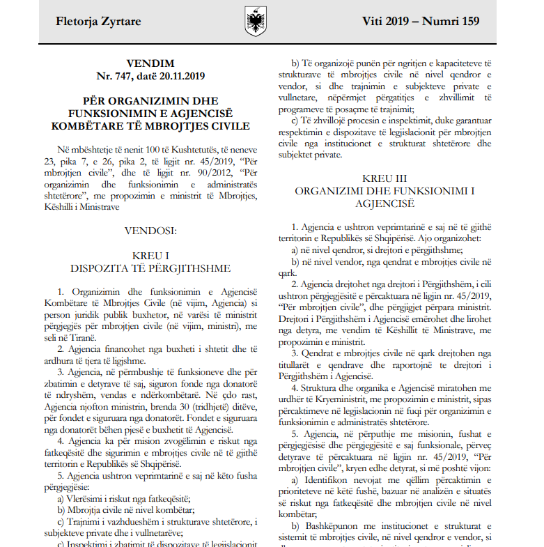 Por që prej miratimit të ligjit qeveria nxori me disa muaj vonesë aktin nënligjor për funksionimin e kësaj Agjencie, e cila suprimonte strukturën, Drejtorinë e Përgjithshme të Emergjencave Civile. Pikërisht më 20 nëntor qeveria mori dy vendime. Pas afro një muaj pas tërmetit të 21 shtatorit, edhe 6 ditë përpara tërmetit “apokaliptik”, emëroi drejtorin e kësaj Agjencie, Haki Çakon, si dhe miratoi VKM-në e posaçme për mënyrën e funksionimit të këtij institucioni. Por VKM-ja e 20 nëntorit është publikuar nga Qendra e Botimeve Zyrtare më 27 nëntor, një ditë pas tërmetit prej 6,4 ballësh.