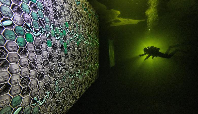 Një zhytës përdor një pishtar për të eksploruar vepra arti nën akullin e Detit të Bardhë, në brigjet e Republikës së Karelias, Rusi. Pikturat dhe skulpturat nga artisti Denis Lotarev dhe punimet e fotografit Viktor Lyagushkin janë vendosur nën ujë dhe të arritshme për zhytësit derisa akulli të shkrihet.\Reuters