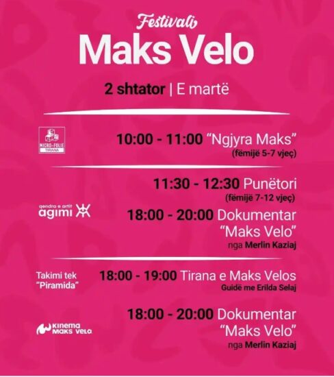 Festivali “Maks Velo” është konceptuar si një festë përkujtimore që ndërthur aktivitete të shumta: shfaqjen e dokumentarit të Merlin Kaziaj mbi biografinë e artistit, punëtorinë artistike për fëmijë si një urë lidhëse mes brezash, si edhe guidat në objektet e konceptuara nga Maks Velo si arkitekt, udhëhequr nga Erilda Sulaj.