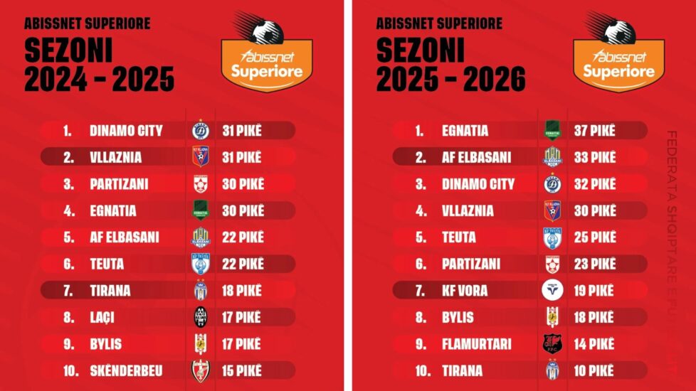 Ndërsa këtë herë ka 32 pikë në vendin e 3-të. Shtatë pikë më shumë se Teuta e vendit të 5-të, që ka 3 pikë më shumë dhe një vend më lart se në sezonin 2024-2025.
