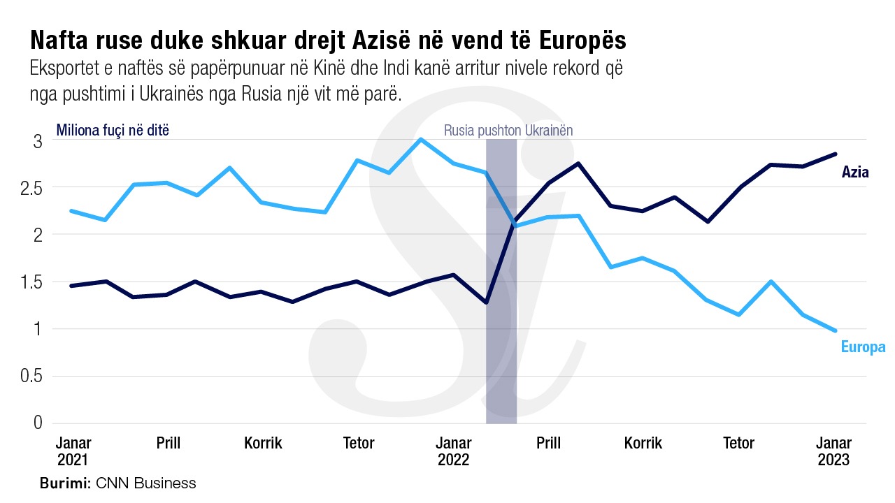 Eksportet e naftës ruse në Kinë dhe Indi arritën të dyja nivelet rekord në janar pasi ndalimi i Evropës për naftën ruse në det hyri në fuqi, sipas Kpler, një kompani të dhënash dhe analitike. Eksportet drejt Turqisë, një tjetër klient kryesor, gjithashtu vazhduan me shpejtësi. (Ndalimi i produkteve të naftës së rafinuar nuk filloi deri në shkurt.)