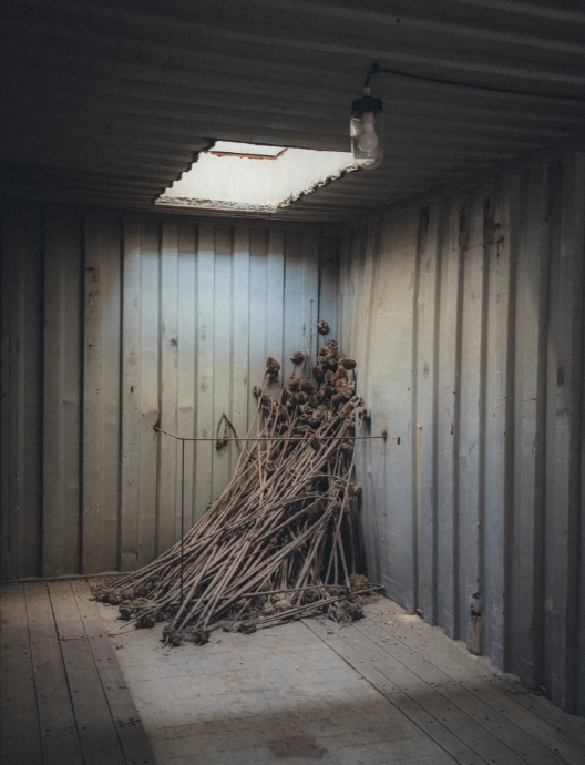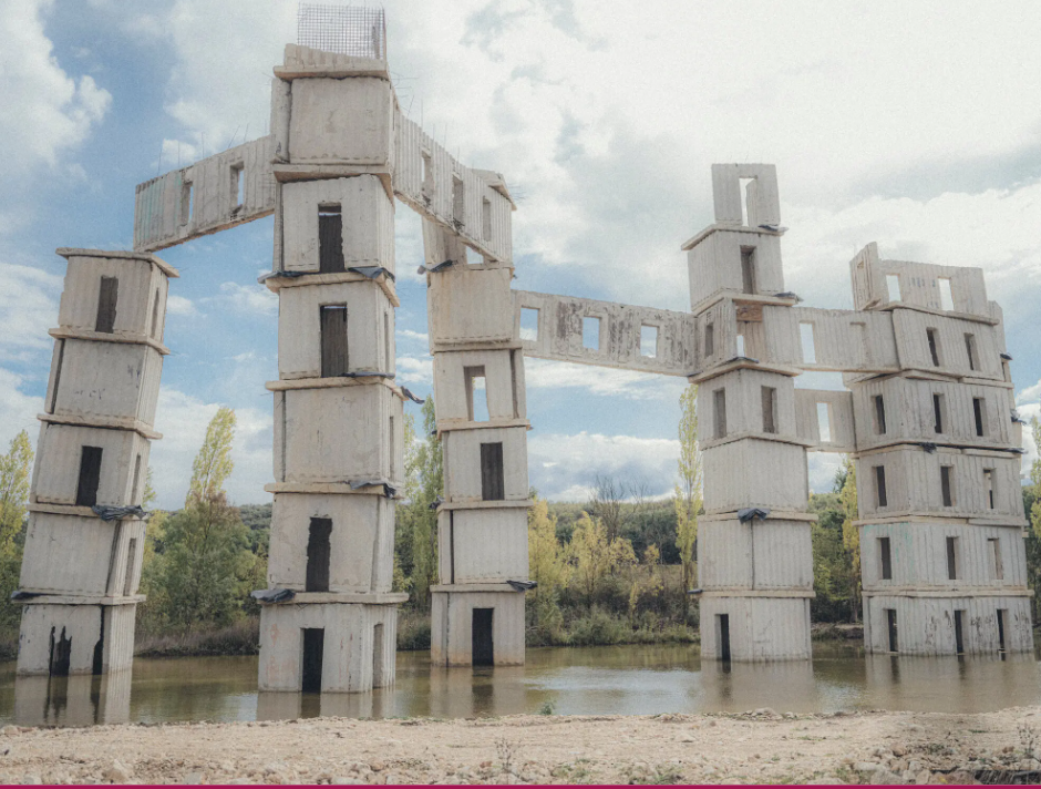 Kullat e pjerrëta të bëra nga kontejnerë anijesh të hedhura sfidojnë gravitetin për të dërguar hijet në pishina të valëzuara. Një amfiteatër i madh, i varur me mbështjellje filmi të zbehur, është një monument i mundësisë dhe prishjes, nga ballkonet e sipërme të mbushura me dritë deri te tunelet e mbytur poshtë skenës. Luledielli të thata dhe librat e krijuar nga plumbi janë tema të përsëritura të një bote që rri pezull në gjysmën e mesit midis jetës dhe vdekjes.