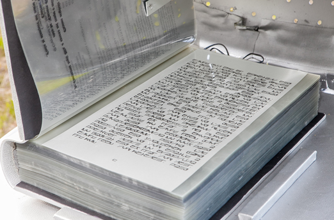 Santelia jo vetëm që i shkruan librat mbrapsht por i shkruan ato duke përdorur vetëm 4 tastiera, pa i parë kurrë ato që ka shkruar.