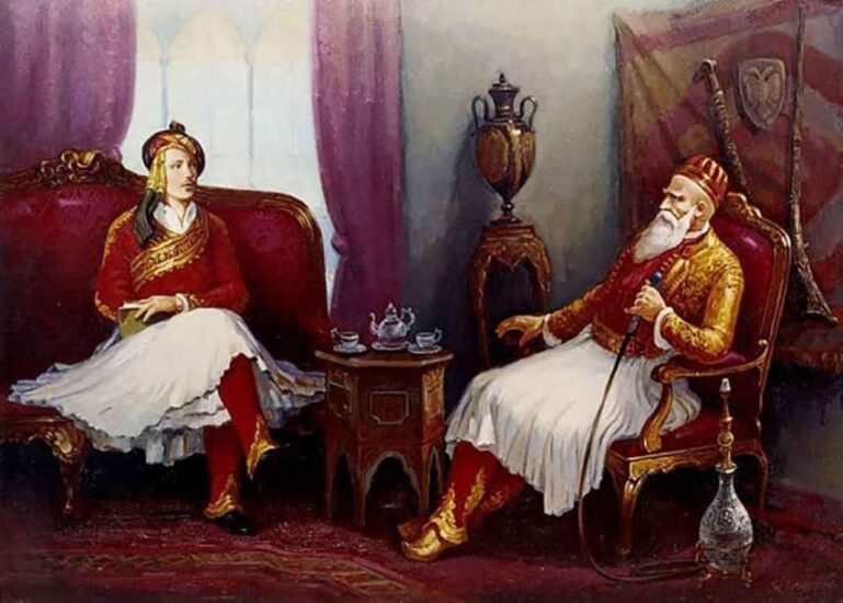 “Kam disa petka shqiptare madhështore, e vetmja plaçkë e shtrenjtë në këtë vend. Kushtojnë 50 ginea secila, dhe kanë aq flori të qëndisur sa në Angli mund të kushtojnë 200 ginea. U njoha me Hysen Beun dhe Mahmud Pashën, të dy djem të vegjël, nipër të Ali Pashës në Janinë. Janë krejt ndryshe nga çunakët tanë, kanë fytyrë të kuqe si vejushat e lyera me të kuqe, kanë sy të zes, të mëdhenj dhe tipare fare të rregullt. Janë krijesat më të bukura që më ka zënë syri dhe të rrahur e të stërvitur që tani me ceremonira të Oborrit” shkruante Bajroni në shënimet e tij