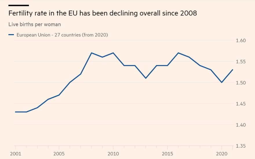 Siç e shohim në grafikun e mëposhtëm, të ofruar nga Eurostat, agjencia statistikore e BE-së, shkalla e lindshmërisë së bllokut 27-vendesh në vitin 2021 ishte 1.53 lindje të gjalla për grua. Franca kishte normën më të lartë të lindshmërisë (1.84), ndërsa më të ulëtat ishin në Maltë (1.13), Spanjë (1.19) dhe Itali (1.25). Situata e Italisë i kushton vëmendje më të madhe. Siç raportoi Amy Kazmin, korrespondentja e FT në Romë në qershor, Italia regjistroi 393,000 lindje vitin e kaluar, 27 për qind më pak nga dy dekada më parë dhe më e pakta që nga bashkimi i vendit në 1861.