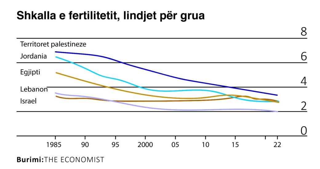 Baza e një shoqërie rinore është një shkallë e lartë e fertilitetit, numri i fëmijëve që një grua tipike do të ketë gjatë jetës së saj. Shkalla në territoret palestineze, duke përfshirë Gazën (popullsia totale 2 milion) dhe Bregun Perëndimor (3 milion), ishte 3.4 në vitin 2021, sipas Divizionit të Popullsisë së OKB-së.