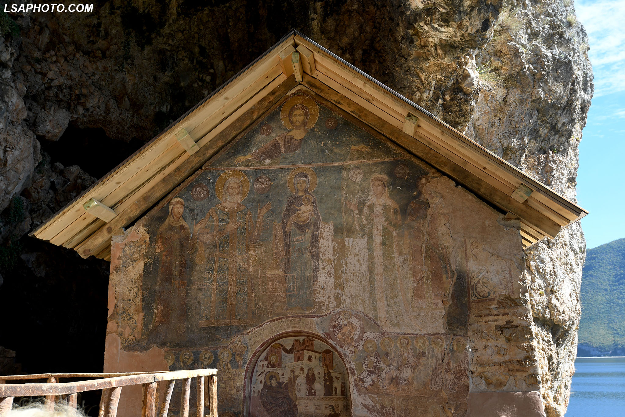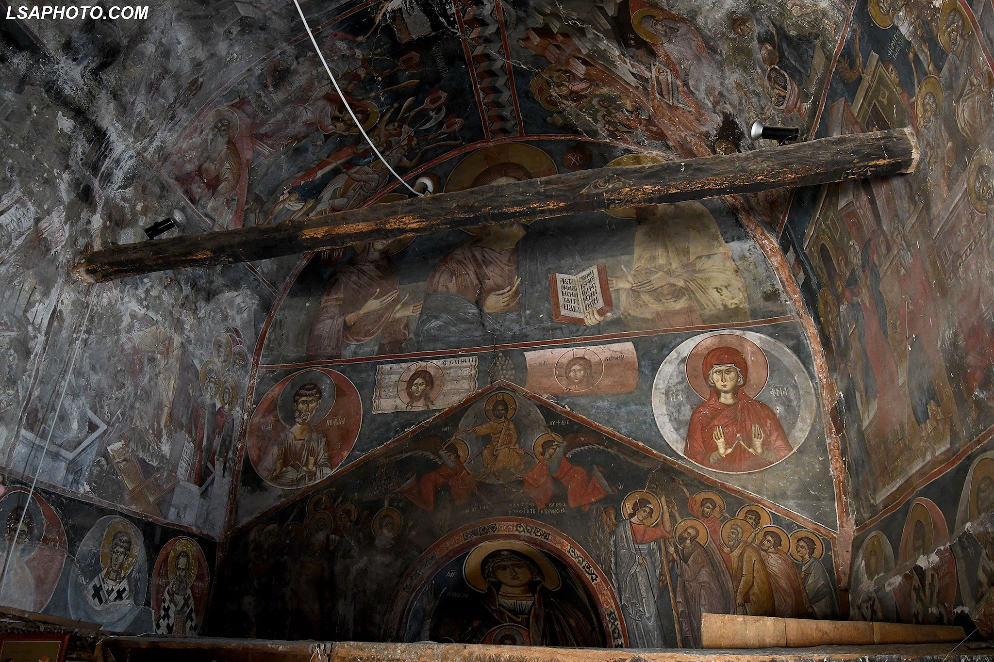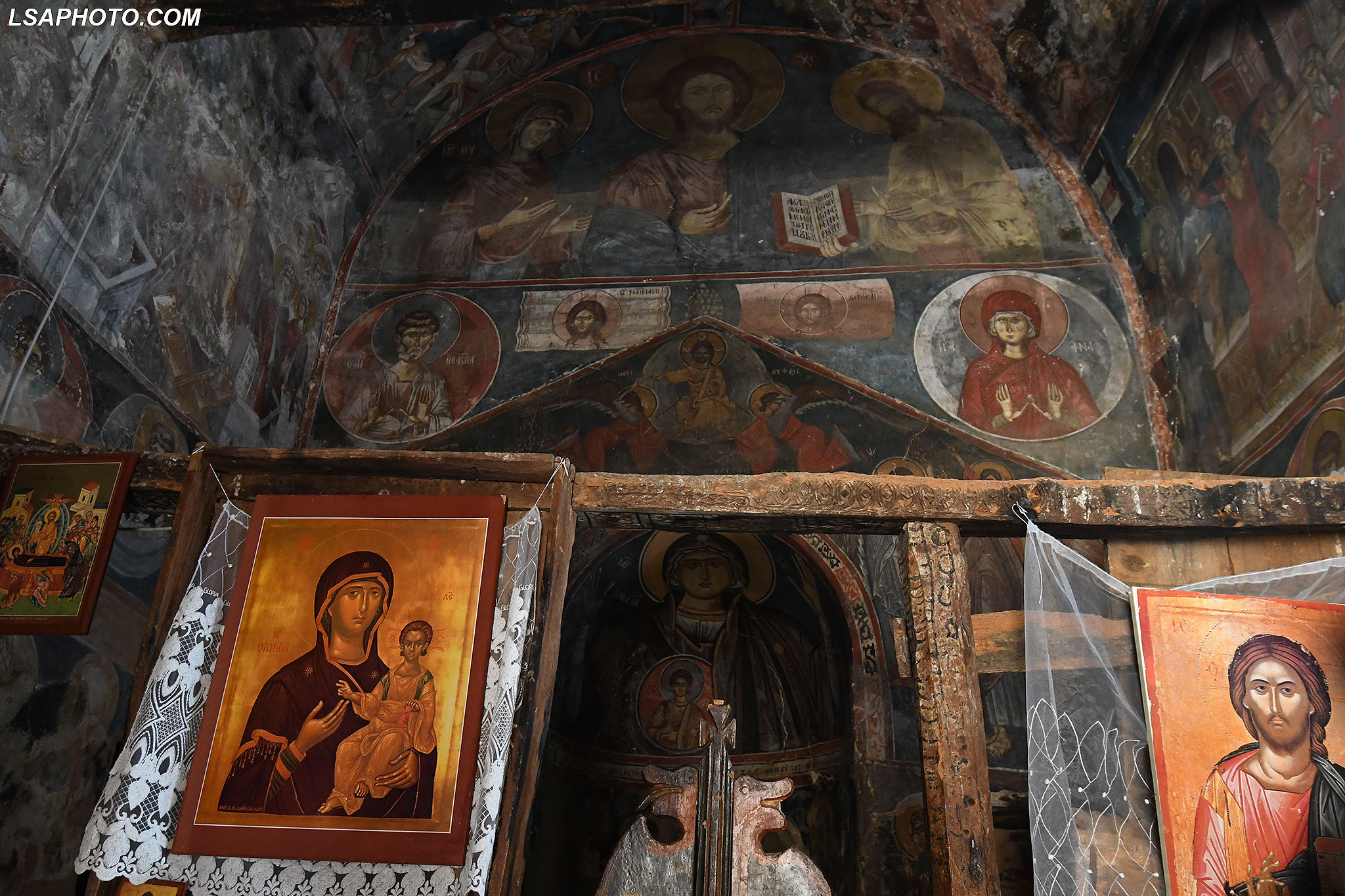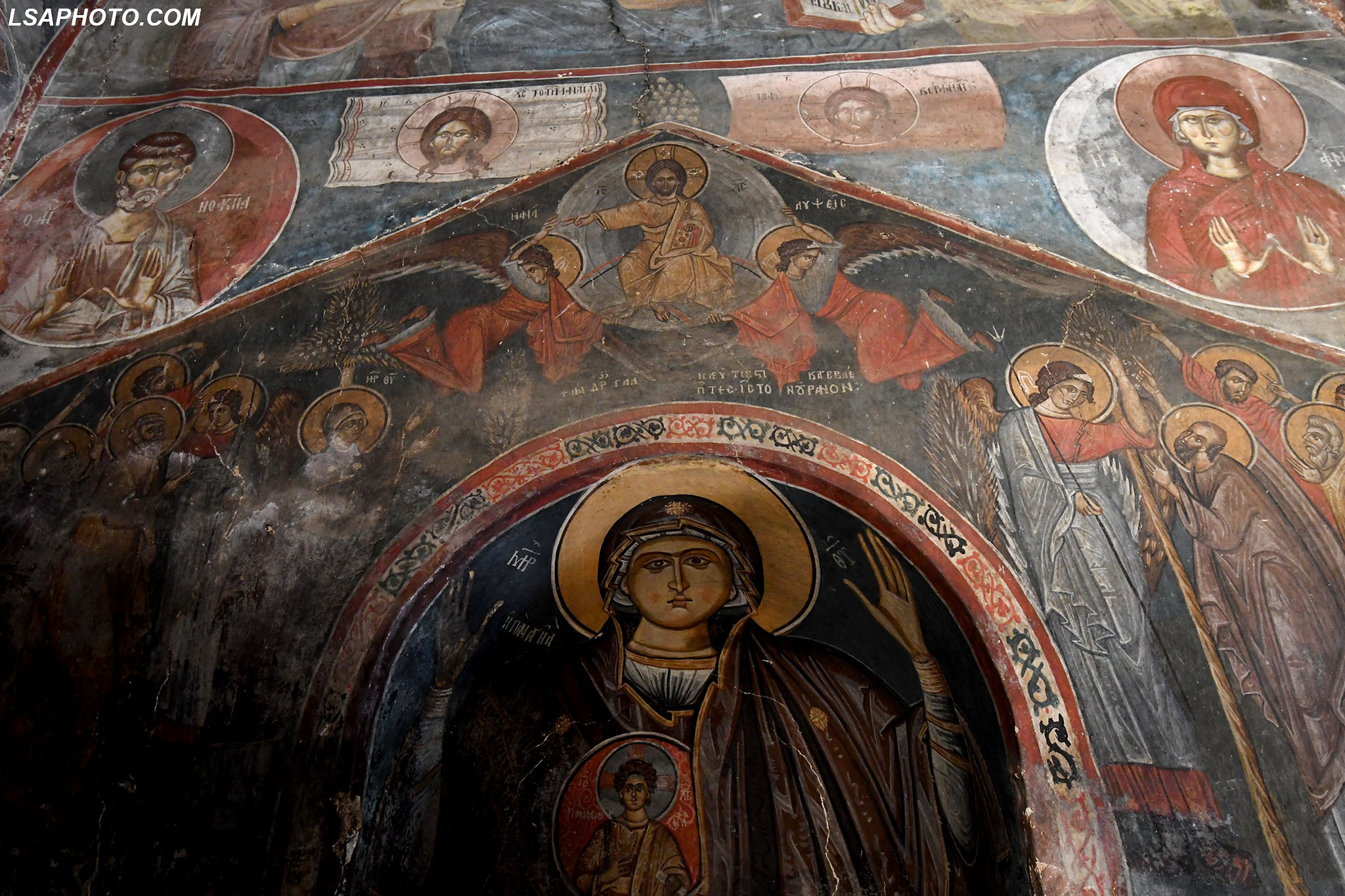 Për herë të parë në afresket e kësaj kishe (foto poshtë) vërehen tentativa në mënyrë arkaike dhe naive të disa përfytyrimeve të shenjta. Kemi figurën e Shën Mërisë të pikturuar në shkëmb që datojnë që nga shek V.