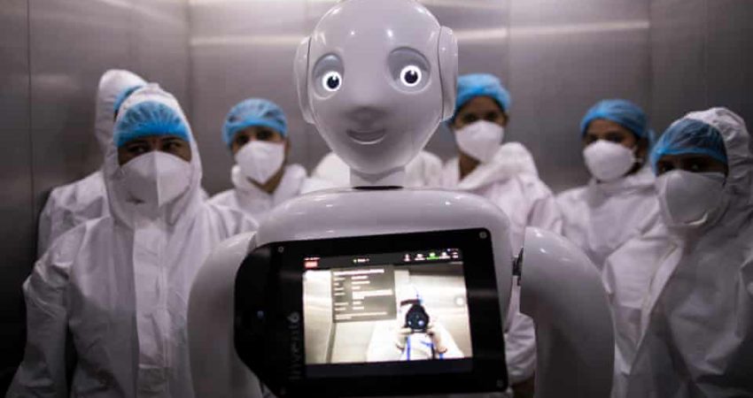 Një robot i cili përdoret për të ndihmuar pacientët me Covid-19 po pret në një ashensor në spitalin Yatharth në Nju Delhi./The Guardian