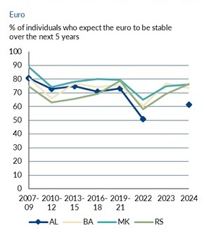 I njëjti raport, tregon se 60% e shqiptarëve kanë shpresë së euro do të stabilizohet për të paktën 5 vitet e ardhshme.