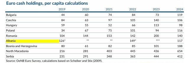 Shifrat i referohen vitit 2024 dhe vërehet një rënie e preferencës për euro, të paktën krahasuar me vitin 2022 kur një shqiptar mbante 149 euro cash në xhep. Për vitin 2023, raporti thotë se nuk ka të dhëna të disponueshme.