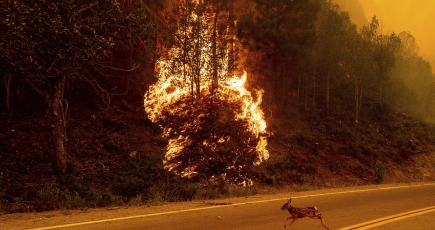 Një sorkadhe vrapon në rrugë ndërsa zjarri ka nisur në pyllin kombëtar Plumas California/Fotografi: Noah Berger /