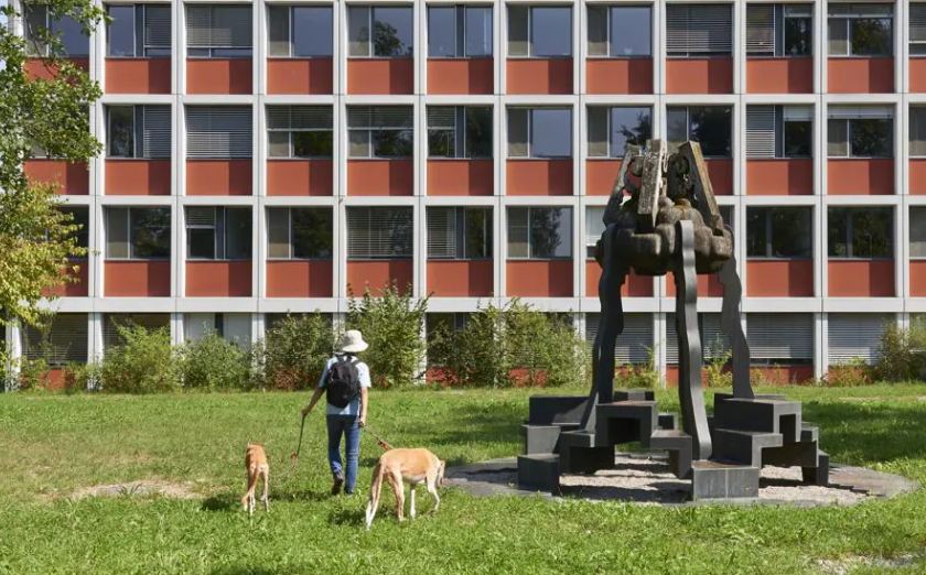 Le të marrim pllakat e mëdha nga Gloria Friedmann, “Paraardhësit e së Ardhmes”, të gjetura në atriumin e ndërtesës kryesore, të bëra prej druri të karbonizuar, pendëve të korbit të zi, dheut të thatë dhe materialeve të tjerë. Që nga fillimi këto tabela kanë qenë një burim diskutimesh të nxehta, shumë ishin të bindur se ato nuk ishin të përshtatshme për njerëzit e zakonshëm. Sot ato pllaka janë bërë një pjesë integrale e arkitekturës. Jashtë në Labirintin e tij fëmijët luajnë dhe disa vizitorë ose pacientë ulen në oborrin e brendshëm.