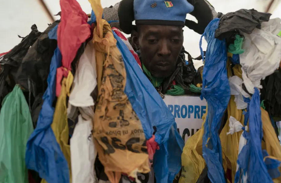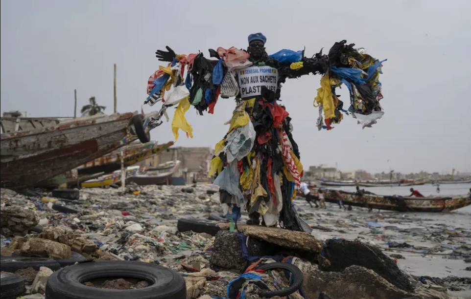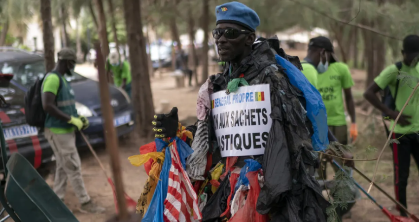 Aktivisti mjedisor Modou Fall, të cilin shumë e quajnë thjesht “Njeriu plastik” thotë se ky nuk është thjeshtë një kostum por është një mënyrë për të treguar shqetësimin e tij.