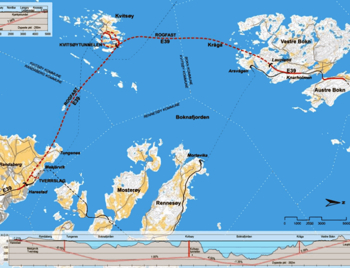 Tuneli Rogfast, nën Boknafjorden, do të përbëhet nga dy tuba njëdrejtimësh, secili 26.7 kilometra i gjatë. Pasi të përfundojë, do të jetë tuneli rrugor nënujor më i gjatë në botë, ekuivalent me kalimin nëpër tunelet Mont Blanc dhe Fréjus njëri pas tjetrit, duke lënë dy kilometra rrugë të mbetura.