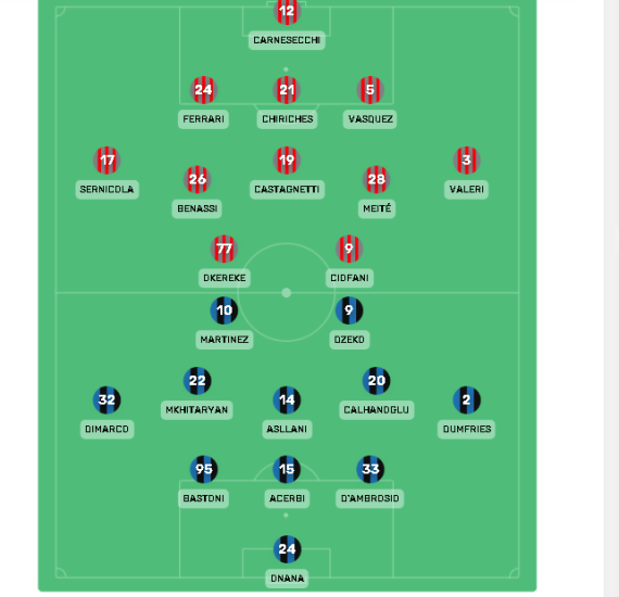 Brozoviç nuk është ende gati, kurse Barela është i skualifikuar për shkak kartonësh. Në këto kushte, një nga tre mesfushorët në formacionin e Interit do të jetë Asllani. Bashkë me të do të luajnë titullarë Mkhitarian dhe Çalhanoglu.