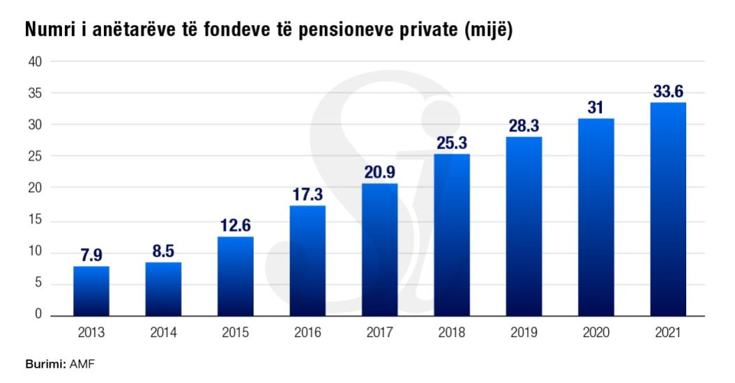 Të dhënat nga Autoriteti i Mbikëqyrjes Financiare (AMF) tregojnë se numri total i anëtarëve në fondet e pensioneve private arriti në 33 571. Gjatë vitit 2021, këtyre fondeve iu janë shtuar rreth 2600 kontribuues.