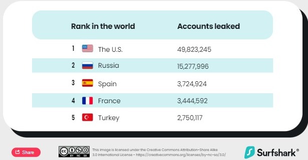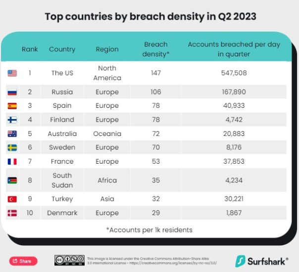 SHBA qëndron e para në tremujorin e dytë të 2023. Ajo përfaqëson 49.8 milionë llogari të shkelura. Llogaritë amerikane përbëjnë 45% të totalit në tremujorin e dytë, duke u rritur me 830% nga 5.4 milion në tremujorin e mëparshëm.