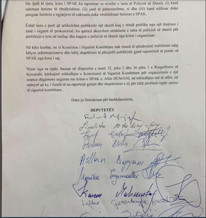 Deputetët e opozitës në Komisionin e Sigurisë, kanë firmosur një shkresë zyrtare ku kërkojnë seancë dëgjimore me kreun e SPAK, Altin Dumani.