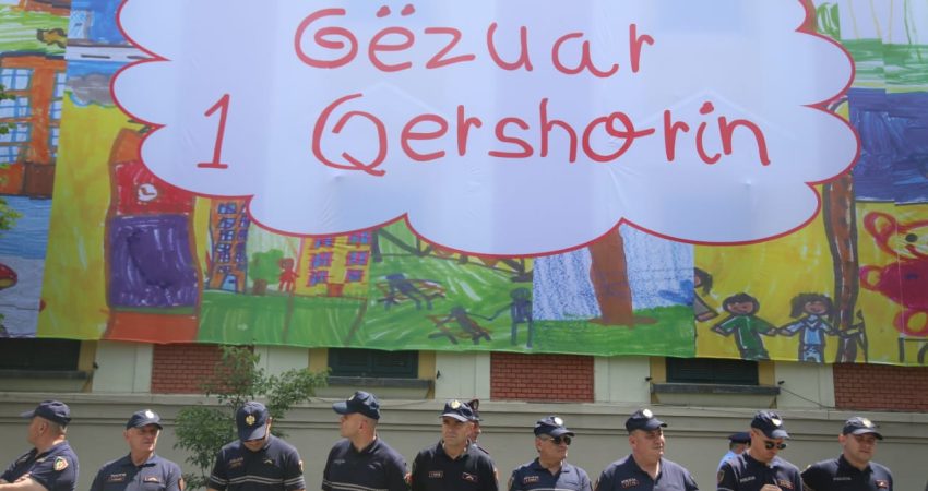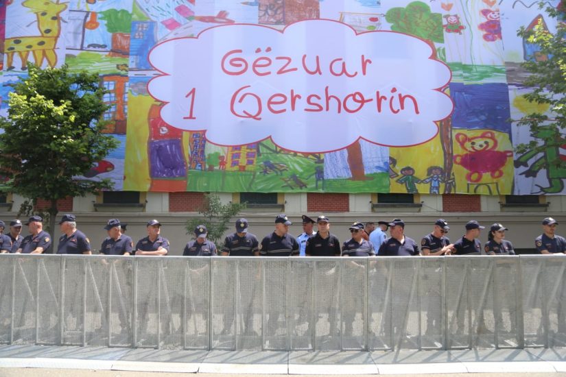 Ndryshe nga herët e tjera, këtë herë protestuesit kanë përballë një banderolë të madhe kushtuar festës së 1 Qershorit, Ditës së Fëmijëve.