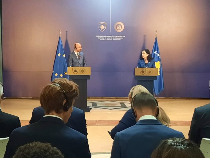Presidenti i Këshillit Europian, Charles Michel, në një konferencë për media, pas takimit me presidenten Vjosa Osmani, është shprehur se BE-ja do të vazhdojë të mbështetë Kosovën.