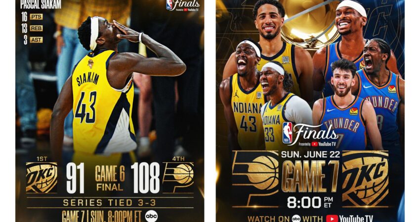 Për të parën herë në 9 vitet e fundit Kampionia e re në NBA do të përcaktohet nga ndeshja e 7 Finale pasi Indiana Pacers mundi Oklahoma City Thunder 108-91 Finalen e 6. Një paraqitje mbresëlënëse e sulmit të Pacers që u ndihmua edhe nga 20 pikët e Obi Toppin nga pankina, i ndaloi Thunder të fitonin titullin në Indianapolis. Heroi vendas Tyrese Haliburton, që humbi ndeshjen e 5 për një dëmtim në pulpë u aktivizua për 22 minuta duke shënuar 14 pikë, dhënë 5 asists e duke rrëmbyer dy topa. Kjo fitore nënkupton se NBA do të duhet të presë edhe pak ditë deri në Finalen e 7 për të njohur kampionen e re.