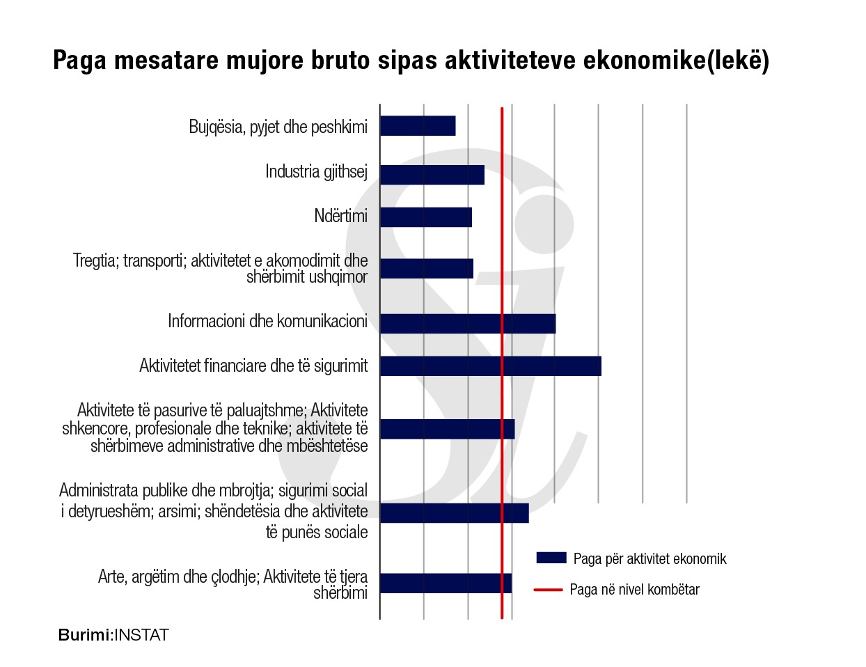 Për periudhën janar-mars të këtij viti, punonjësit e sektorit financiar kanë pagën më të lartë bruto, duke kaluar mesataren kombëtare me 81.2%. Punonjësit e sektorit të bujqësisë, pyjeve dhe peshkimit rezultojnë me pagën më të ulët bruto në vend, 37.1% poshtë mesatares kombëtare.