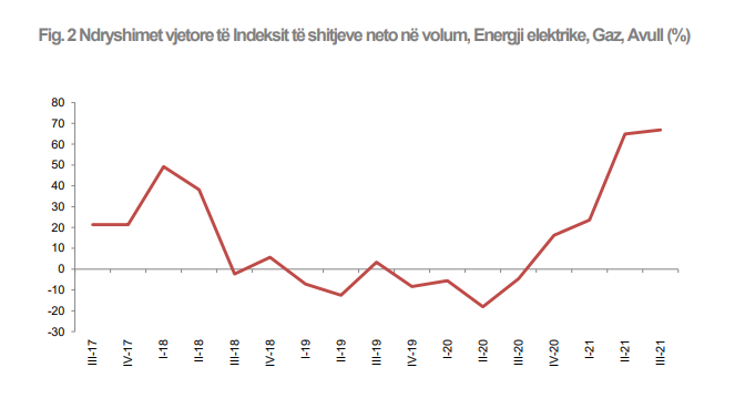 Indeksi i shitjeve neto në volum shënoi rritje 66.9% në sektorin e energjisë elektrike, gazit dhe ujit, krahasuar me të njëjtën periudhë të një viti më parë, sipas të dhënave të INSTAT.