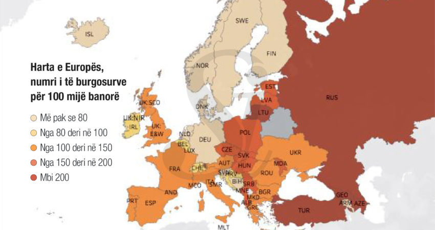 Numri i personave të burgosur në Shqipëri ra lehtë në 2020 në krahasim me 2019, por sërish mbetet në shifra shumë herë më të larta se mesatarja europiane për 100 mijë banorë. Këshilli i Europës publikoi raportin vjetor të popullsisë në 51 burgje të vendeve anëtare të KiE.